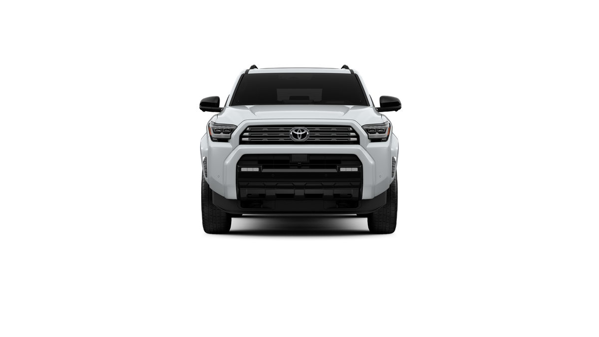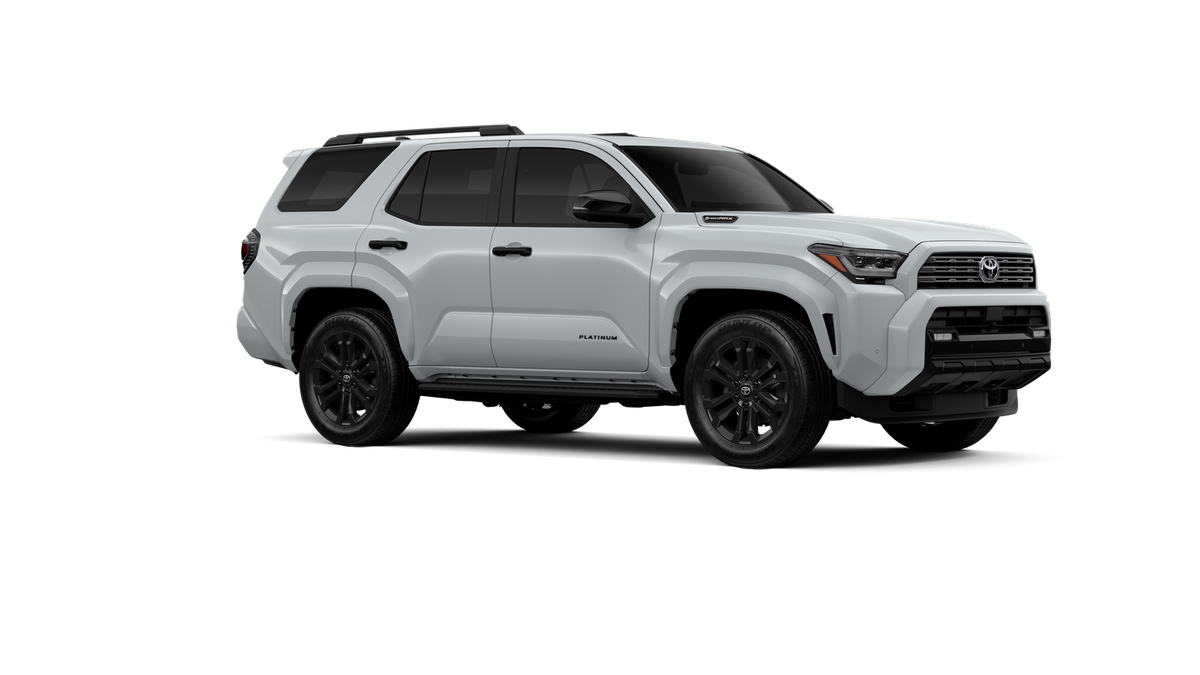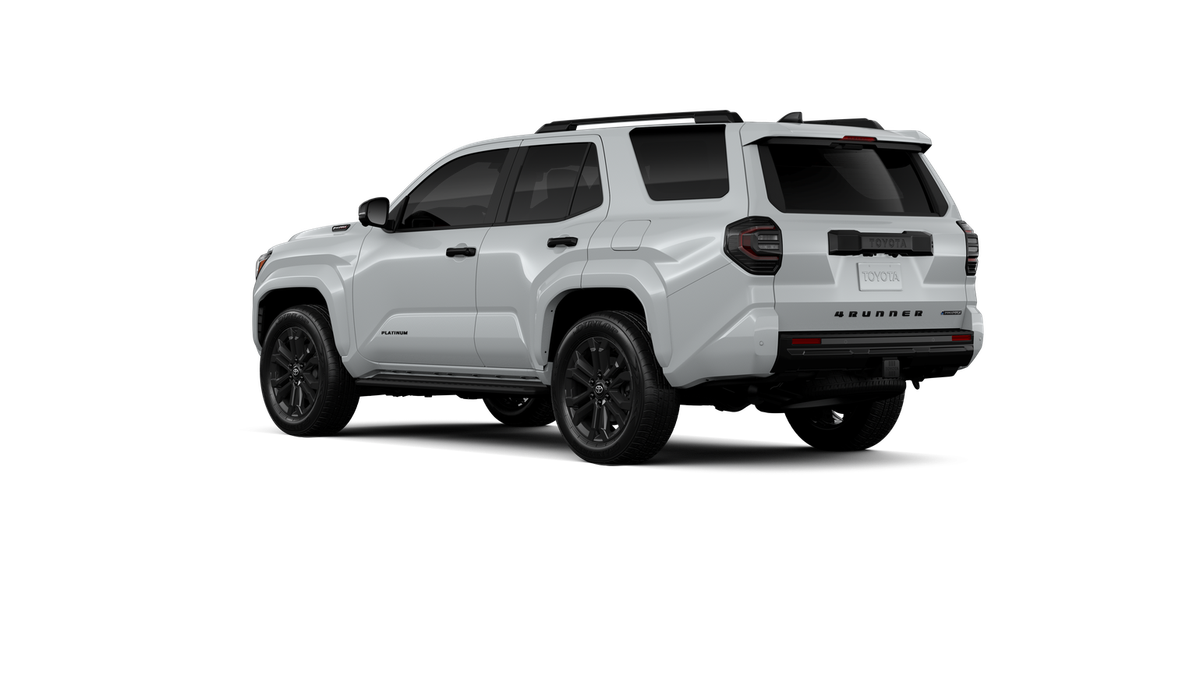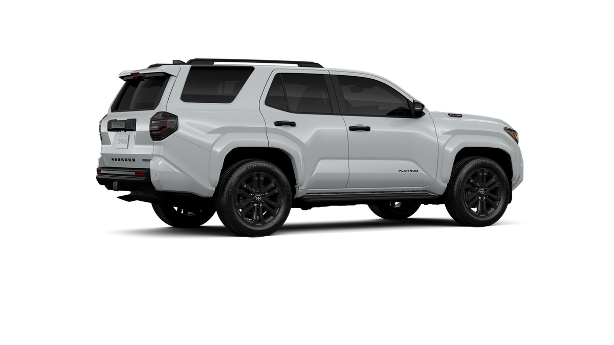- Dark-chrome tri-bar grille; gloss-black mirror caps and door handles; color-keyed overfenders and rear spoiler; gloss-black "PLATINUM" and "4RUNNER" badges