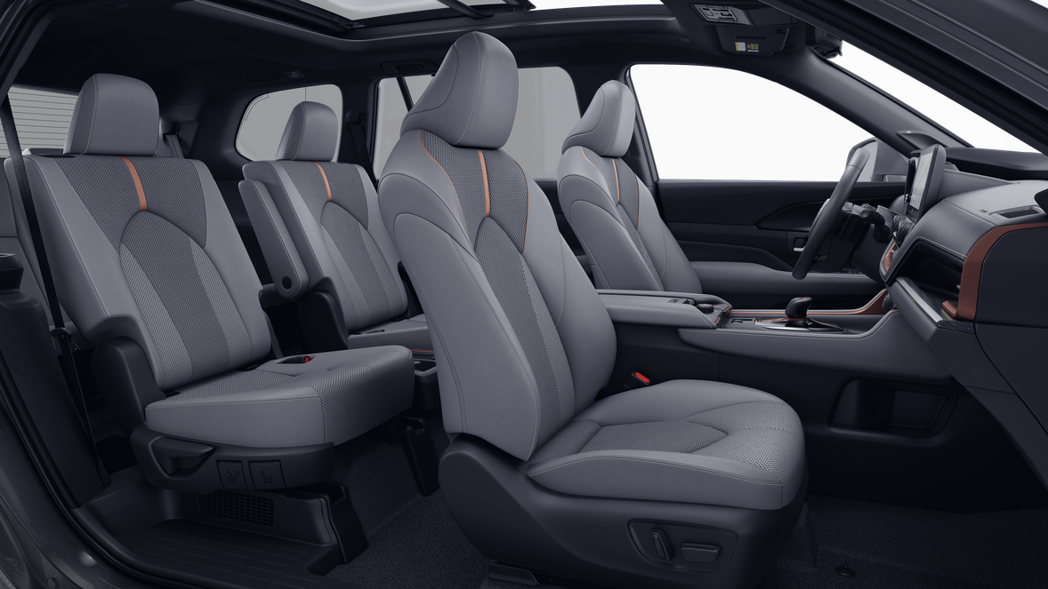 - 7-passenger seating with second-row fold-down captain's chairs and fold-down inboard armrests, adjustable headrests and two cup holders mounted on the floor; and 60/40 split, fold-down third-row seats with sliding headrests and recline function
